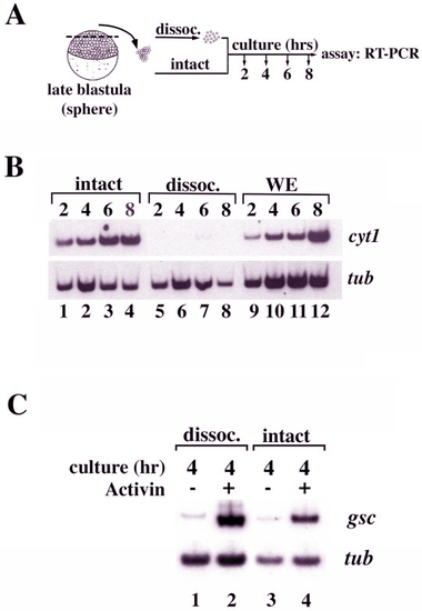 Dissociation of zebrafish animal caps disrupts cyt1 expression. A: Schematic overview of experimental design. Animal caps were dissected at late blastula stages (sphere stage, 4 hpf), aggregated in groups of 10 and used intact or dissociated into individual cells (see Experimental Procedures section), followed by culture for various periods of time. After the culture period, explants and cells were harvested and assayed for cyt1 expression by reverse transcriptase-polymerase chain reaction (RTPCR; see Experimental Procedures section). B: Blastula stage intact caps (lanes 1–4), dissociated caps (lanes 5–8), and whole embryos (lanes 9–12) were cultured for 2 hr (until 6 hours postfertilization [hpf], equivalent to early gastrula), 4 hr (until 8 hpf, equivalent to mid-gastrula), 6 hr (until 10 hpf, equivalent to end of gastrulation), or 8 hr (until 12 hpf, equivalent to onset of somitogenesis) before harvesting and analysis for cyt1 expression by RT-PCR. tub expression was used as a loading control. C: Blastula stage dissociated caps (lanes 1 and 2) and intact caps (lanes 3 and 4) were cultured for 4 hr (until 8 hpf, equivalent to mid-gastrula) in the absence (lanes 1 and 3) or presence (lanes 2 and 4) of 1 μ/ml human activin A and assayed for gsc expression by RT-PCR. tub expression was used as a loading control.