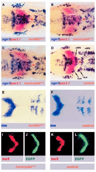 The activity of both Him and Her5 is necessary to prevent neurogenesis across the medial IZ in vivo. (A-D) The inhibition of either Him or Her5 function triggers ectopic neurogenesis in place of the MIZ (dorsal views of the MH region in flat-mounted embryos at the four-somite stage, anterior to the left). Embryos are probed for ngn1 (blue) and pax2.1 (red) expression following injection of her5MOATG(A), himGripNAATG (B), himGripNASPL (C) (orange labels), compared to a non-injected WT control embryo (D). Note that the vcc and r2MN are bridged by ectopic ngn1-positive cells (double arrows) after blocking Her5 or Him activity, while other undifferentiated areas are not affected (e.g. area between r2MN and r4MN, asterisk. (G-L) him and her5 expression are not successive and interdependent steps of the anti-neurogenic cascade acting in the MIZ (dorsal views of the MH area in flat-mounted embryos at the three-somite stage, anterior to the left, used markers are color-coded). (G,H) him expression in wild-type embryos (H) or after injection with her5MOATG (G). Note that him expression is not modified. (I-L) Expression of her5 (I,K) and GFP (J,L) in her5PAC::egfp embryos injected (K,L) or not (I,J) with himGripNAATG. Note that her5 and GFP expression are unaffected. vcc: ventro-caudal cluster, r2MN: prospective motorneurons of rhombomere 2, r4MN: prospective motorneurons of rhombomere 4.