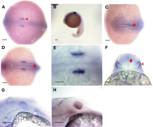 In situ hybridizations showed cldnj expression in the ear and hindbrain. (A) Seven somite embryo, dorsal view (B) 18 hpf embryo, lateral view low magnification. (C) 18 hpf embryo, dorsal view of head, note weak staining throughout brain marked by red arrow. (D) 18 hpf embryo, dorsal view of otic vesicles. (E) High magnification of 18 hpf embryo, dorsal view of otic vesicles (F) 31 hpf embryo, otic vesicles and hindbrain, posterior view imaging directly through the hindbrain (similar to histological cross-sections in Fig. 2), red arrowhead indicates staining is dorso-lateral in the vesicle. Red arrow marks increased signal of cldnj at the midline of the brain. (G) 31 hpf embryo, lateral view with cldnj staining in the otic placode. (H) 48 hpf embryo, lateral view. Scale bar=100 μm. |