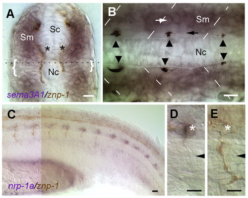 The expression patterns of sema3a1 and nrp1a correlate with extension of CaP axons along the common pathway. In situ hybridization (purple) for sema3a1 (A,B) or nrp1a (C-E) with immunostaining (brown) by mAb Znp1 that labels primary motor axons in 26-somite stage (22 hpf) embryos. Unless otherwise noted, embryos are oriented with rostral leftwards and dorsal upwards. (A) A transverse section of the trunk with dorsal upwards showing that sema3a1 is expressed in the dorsal and ventral regions of the myotome and less so in the horizontal myoseptal region (brackets). Asterisks indicate CaP motoneurons whose axons extend along the medial surface of the myotome. Sm, somite; Nc, notochord; Sc, spinal cord. Broken line indicates the level of the horizontal section shown in B. (B) A horizontal section with rostral leftwards, showing that the myotome cells immediately adjacent to the notochord, which CaP axons (arrowheads) extend upon, express little to no sema3a1 (black arrow). However, the more lateral cells express higher levels of sema3a1 (white arrow). Broken lines indicate somite borders. (C) Lateral view of the trunk showing that nrp1a is expressed segmentally in ventral spinal neurons that, based upon their axon trajectory, correspond to CaP neurons. Presumptive VaP (variable primary) neurons that arise in about half of the hemisegments as equivalent pair of CaP, but later die, may also express nrp1a. The expression of nrp1a declines in more anterior and developed CaPs. (D) nrp1a is expressed by CaP motoneurons (asterisk) while they are extending along the common pathway. (E) nrp1a expression is much reduced in CaP neurons (asterisk) with axons (mAb Znp1 immunostained in brown) extending onto the specific ventral pathway. Arrowheads in D,E indicates the position of the horizontal myoseptum. Scale bars: 20 μm.