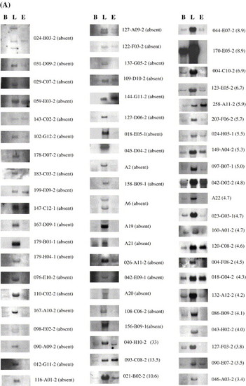 Classification of liver-enriched genes in zebrafish. RNA samples were extracted from the dissected liver and liver-free body, respectively. In panel A, RNA samples from 3 dpf embryos were also included. Probes were derived from EST clones or gene fragments cloned in plasmid vector via RT-PCR using gene-specific primers (Table 1; Supplementary Table 4). RNA hybridization blots were arranged according to the descending ratio of expression levels of liver vs. liver-free body (as indicated in the bracket). We arbitrarily grouped this set of genes according to the ratio of expression level. Genes with ratios more than 6.9 are considered as liver-specific genes, ratios between 6.9 and 2 as highly-liver-enriched genes and ratios less than 2 as moderately-liver-enriched genes. Clone identification is shown on the right side. Hybridization intensity was quantified using software Molecular Analyst (Bio-rad). B, liver-free body; L, liver; E, 3 dpf embryos. |