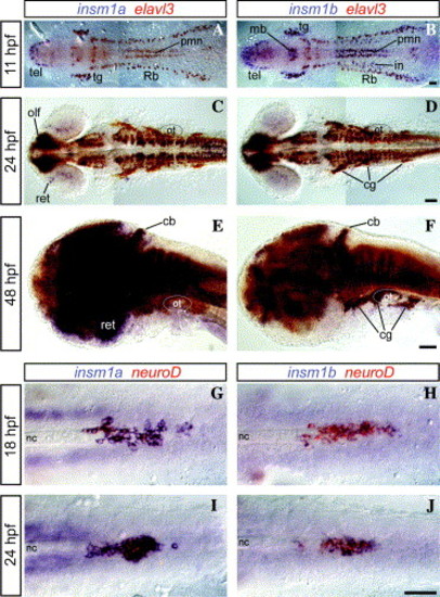 Neuronal and pancreatic expression of insm1a (A, C, E, G, and I) and insm1b (B, D, F, H, and J) in zebrafish. All panels show anterior to the left with complete (A–D), lateral (E and F), and ventral focal planes (G–J). Scale bars represent 50 μm. Fluorescein labeled elavl3 (A–F) or neuroD (G–J) antisense probe was used to indicate specified neurons or pancreatic cells (red), respectively. insm1 is shown in purple and the resulting overlap appears brown with varying intensities. At 11 hpf (A and B) elavl3 is expressed in neurons of the early CNS and insm1 overlap this expression precisely in several types of neurons. At 24 hpf (C and D) there is a large degree of overlap between insm1 and elavl3. By 48 hpf (E and F) elavl3 labels the entire CNS and darker regions indicate where insm1 is expressed, notably the cranial ganglia for insm1b and retina for insm1a. As a reference for elavl3-only (red) neurons, insm1a is not present in pmn at 11 hpf and barely detectable in the cranial ganglia at 24 hpf; otic vesicles are indicated for positional reference. Pancreatic expression of insm1a and insm1b coincide with neuroD in a disorganized manner at 18 hpf (G and H) and later come together to a continuous expression domain at 24 hpf (I and J). cb, cerebellum; cg, cranial ganglia; in, interneurons; mb, midbrain; nc, notochord; olf, olfactory placode; ot, otic vesicle; pmn, primary motoneurons; Rb, Rohon-beard neurons; ret, retina; tel, telencephalon; and tg, trigeminal ganglia. |