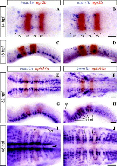 Hindbrain expression of zebrafish insm1a (A, C, E, G, and I) and insm1b (B, D, F, H, and J). Rhombomeres 3 and 5 are marked by egr2b (A–D) or ephA4a (E–J) expression (red). All panels are shown with anterior to the left in ventral (A, B, E, F, I, and J) or mediolateral (C, D, G, and H) focal planes. Scale bars represent 50 μm. At 14 hpf (A and B) insm1a and insm1b are seen in rhombomeres 2 and 4. At 18 hpf (C and D), insm1a becomes more prevalent in the ventral hindbrain while insm1b is fairly dispersed. During pharyngula stages (32 hpf; E–H) insm1a expression is dominant adjacent to the midline and insm1b in the cranial ganglia. Alternating large and small gaps representing rhombomeres and rhombomere boundaries, respectively, are seen in r1 through r6. By 48 hpf (I and J) both insm1a and insm1b occupy a dorsoventral plane that extends laterally, directly adjacent to rhombomere boundaries (arrows). However, this plane does not extend entirely to the edge of the rhombomere, instead it converges within a rhombomere to form a funnel-shape (asterisk) between posterior and anterior segments of adjacent rhombomeres. There is considerable expression of insm1a adjacent to the midline (arrowhead). For lateral views tissues surrounding the hindbrain were removed for clarity. Note that the majority of egr2b or ephA4a staining is dorsal (seen in C and D) which results in a blurred boundary in the ventral focal planes shown. cb, cerebellum; ot, otic vesicle; and r, rhombomere. |