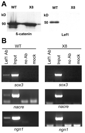 Lef1 associates with the sox3 promoter in vivo. (A) Western blot of whole-embryo lysates probed with anti-β-catenin and Lef1 polyclonal antibodies. The Lef1 band is specifically absent in X8 mutants, whereas the positive control β-catenin band is present. (B) ChIP analysis of whole-embryo lysates shows that the Lef1 antibody can immunoprecipitate DNA fragments containing Lef-binding sites in the upstream regulatory region of sox3, nacre and ngn1. These fragments do not precipitate in controls lacking antibody or chromatin (mock). In lysates from X8 mutants that lack Lef1 protein, the antibody is unable to precipitate these fragments, suggesting that the interaction is specific to Lef1.