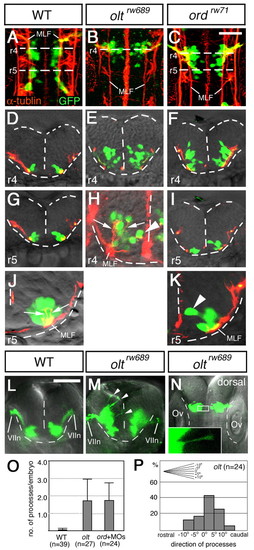 Defective migration of the nVII motor neurons in mutant embryos. (A-K) Wild-type (A,D,G,J), oltrw689 (B,E,H) and ordrw71 (C,F,I,K) Isl1-GFP embryos were stained with anti-acetylated α-tubulin antibody. (A-C) Composite stacks of serial optical sections, shown in dorsal view. (D-K) Images are single focal planes of cross sections at the rhombomeric regions indicated by broken lines in A-C. Hindbrain regions are outlined by broken lines. (H,J,K) Higher magnifications of E, G, I, respectively. In the mutant embryos, some of the neurons reach the ventricular surface (arrowheads in H and K). However, these mismigrated neurons extend axons normally (shown by arrows in H and J). GFP-expression in single axons was barely detectable (H). Therefore, the yellow signals of the axons of the nVII motor neurons in the wild-type embryos (J) are technical artifacts caused by superimposition of the red signals of the axons and the green signals of the cell bodies of the overlapping neurons. (L-P) Aberrant radial processes in the mutant embryos (arrowheads in M). Frontal views of the live wild-type (L) and olt (M) Isl1-GFP embryos at r4, and a dorsal view of the olt Isl1-GFP embryo (N) at 24 hpf. Higher magnification of the boxed region is shown in the inset. (L-N) Images are composite stacks of serial optical sections. (O) Scoring of aberrant processes in the wild-type (WT), olt and ord embryos injected with celsr1a/1b-MOs (ord+MOs). Bars represent S.D. (P) Direction of the aberrant processes was quantified in the olt embryos. The angle of each process was measured as the deviation from the right angle to the midline. Scale bars: 50 μm.