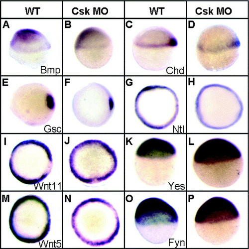 Csk knock down did not affect cell specification, nor expression of known regulators of CE cell movements. Csk-MO injected embryos were fixed at 6 hpf and in situ hybridization was done with various probes: (A and B) bone morphogenetic protein 2b, bmp; (C and D) chordin, chd; (E and F) goosecoid, gsc; (G and H) no tail, ntl; (I and J) wnt11; (K and L) yes; (M and N) wnt5; (O and P) fyn. Either lateral views (A–D, K, L, O, and P) or animal pole views (E–H, I, J, M, and N) are depicted here. |