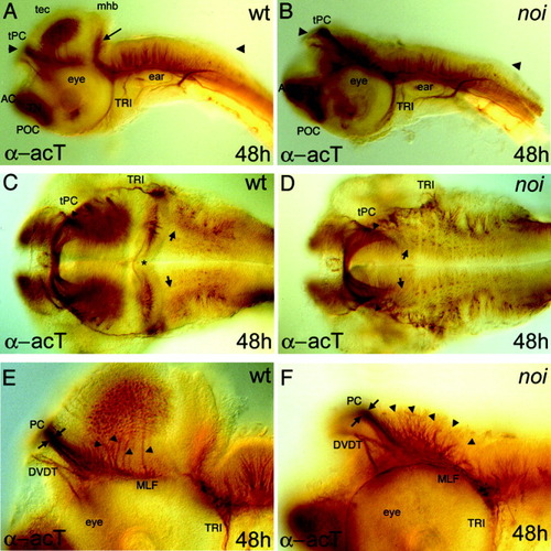 The posterior commissure (PC) and the medial longitudinal fasciculus (MLF) are present but modified in noi mutant embryos. Immunochemical labelling of acetylated tubulin was used to study axon formation in 48 hours (48h) postfertilization embryos, oriented anterior to the left. A,B: A lateral view of whole-mounted embryos. The tectum and the cerebellar fold, including their neurons, e.g., the nervus trochlearis, are absent in the mutant. Arrowheads in A and B mark the layer of the dorsal section in C and D, respectively. C,D: The PC, which demarcates the diencephalic/mesencephalic boundary, is still present. The PC looks more condensed in the mediolateral direction (arrowheads) and hindbrain neurons, visualized in small dots expand anteriorly (arrows). E,F: Higher magnification of the lateral view of the mutant embryo shows additional axons emerging from the dorsal midbrain area (arrowheads) and joining the medial longitudinal fasciculus (MLF). In the anteroposterior direction, the PC appears larger and defasciculated (E,F; arrows). AC, anterior commissure; DVDT, dorsoventral diencephalic tract; mhb, midbrain-hindbrain boundary; tPC, tract of the posterior commissure; POC, postoptic commissure; tec, tectum opticum; TN, telencephalic nucleus; TRI, trigeminal nerve, tro, trochlear nerve; wt, wild-type.