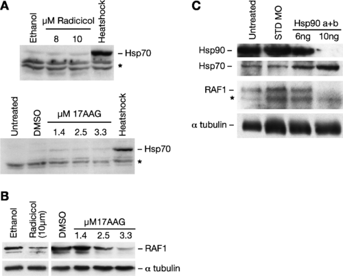 Assessment of Heat Shock Induction and Levels of Hsp90 Inhibition (A) Western blots to assess Hsp70 induction following overnight treatment of WT embryos initiated at 50% epiboly with increasing concentrations of radicicol or 17AAG. As positive control, Hsp70 was induced by incubating embryos at 37 °C for 30–60 min before harvesting. (B) Western blots showing graded reduction in RAF1, an Hsp90 client-protein, in response to inhibition by radicicol and 17AAG. (C) Western blots to assess Hsp90, Hsp70, and RAF1 levels in embryos injected with 6 ng of universal morpholino control (STD MO) or Hsp90 a+b morpholinos at the indicated individual amounts. α-tubulin was used as loading control. *, Nonspecific band showing equal loading