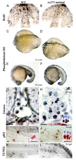 Cell cycle status of zebrafish nz171 mutant embryos compared with wild-type siblings. (A,B) BrdU-labeling to detect cells in S-phase in forebrain and eyes of flat-mounted 18-somite embryos, anterior to top. (C-F) Dorsal (C,D) and lateral (E,F) views of anti-phosphohistone H3 (pH3)-labeling to detect cells in M phase at the stages indicated (anterior to the left). (G-J) Disordered mitotic chromosomes in nz171 mutants. (G,H) Transverse sections bisecting the yolk extension of wild-type (G) and nz171 mutant (H) embryos stained with Giemsa (dorsal to top). Whereas recognizable structures (s, somite; da, dorsal aorta) and normal nuclei (example marked by asterisk) are visible in wild-type embryos, no such structures are visible in nz171 mutants, which have abnormal nuclei with condensed, disorganized chromosomes. pH3-labeled chromosomes of a similar configuration to H (blue arrowheads) appear in nz171 (J) but not in wild-type (I); lateral flat-mounted embryos, mid-trunk (high magnification inset). Scale bar: 20 µm. (K,L) TUNEL labeling indicates prevalent cell death in the ICM and neuronal regions of nz171 embryos; lateral views of tail regions, anterior to the left, showing the ICM region just above the yolk extension (ye).