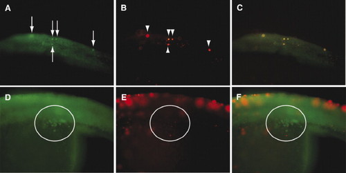 Ectopic PGCs undergo apoptosis. (A) Vasa immunostaining and (B) TUNEL analysis of ectopic PGCs in dorsal trunk of igf1rb-MO-injected embryo; (C; merged image) colocalization of Vasa-positive (arrows) and TUNEL-positive (arrowheads) cells confirms DNA fragmentation in ectopic PGCs. (D) Vasa-positive but (E) TUNEL-negative PGCs in genital ridge (circled) of igf1rb-MO-injected embryo; images merged in panel F. An absence of DNA fragmentation in genital ridge PGCs confirms survival of the subpopulation of PGCs that successfully migrate to the genital ridge. Anterior is to the left in all images; magnification, 200 x. |
