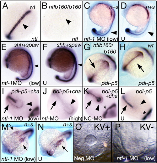 Characterization of low-dose ntl morphant embryos. A,B: Seven to 12 s, dorsal view. From a ntlb160 incross. Arrowhead: notochord. A: Wild-type sib. B: ntlb160 homozygote. C,D: Sixteen to 19 s, lateral view. n+s: ntl + spaw probes. Arrowhead: ntl mRNA in the notochord. C: Injected with 0.3 ng ntl-1 MO. D: U: Uninjected. E,F: Sixteen to 19 s, lateral view. sonic hedgehog (shh; arrowhead) + spaw probes. E: Injected with 0.2 ng ntl-1 MO. F: U: Uninjected. G-L: Arrows: Site of pdi-p5 expression in posterior notochord. Arrowhead: site where cha is normally expressed. G,H: Ten to 14 s. Dorsal view, close-up of tail and tailbud. Head to upper right. Two embryos from a ntlb160 incross. pdi-p5 probe. I-L: Dorsal view of tailbud/KV region, head to lower right. pdi-p5± cha probes. Asterisk: pdi-p5 staining in anterior (out of field of view in J). I-K: Nine to 12 s. L: Seven to 9 s. I: Injected with 0.1 ng ntl-1 MO. J: Injected with 4 ng of ntl-1 MO. K: Injected with 4 ng NC-MO. L: U: Uninjected. M,N: Sixteen to 19 s, dorsal views of the same embryos shown in Figure 2C and D, respectively. Head at lower left, ntl + spaw probes. Arrows: spaw mRNA in lateral plate. M: Injected with 0.3 ng ntl-1 MO. N: U: uninjected. O,P: Nine to 12 s. Brightfield view of tailbud/KV region, live embryos. KV± denotes presence or absence of a visible Kupffer's Vesicle. Neg. MO: scrambled antisense cha MO. O: Injected with 0.85 ng Neg. MO. P: Injected with 0.5 ng ntl-1 MO.
