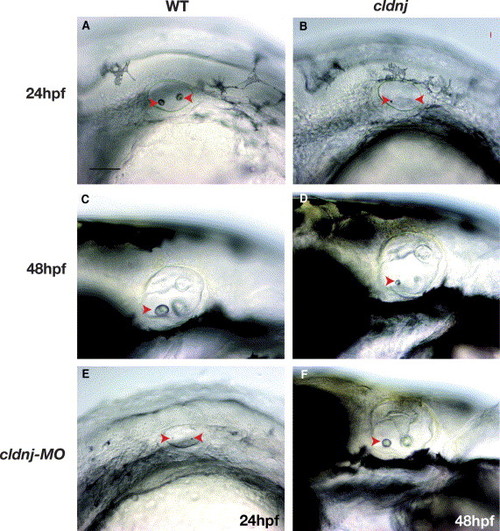 cldnj mutant embryos have reduced otoliths. All images are lateral views of the zebrafish body at the level of the otic vesicle, with the head to the left and the tail to the right. (A–D) Photos of wildtype and mutant ears in the first 2 days of development. (A) 24 hpf lateral view of the zebrafish wildtype ear. Otoliths marked with red arrowheads. (B) 24 hpf lateral view of a cldnj mutant ear. Red arrowheads mark otoliths. (C) Wildtype ear, lateral view at 48 hpf. Red arrowhead marks otolith. (D) cldnj mutant ear, lateral view at 48 hpf. Red arrowhead marks otolith. (E,F) Morpholino phenocopy of cldnj mutation. At 24 hpf cldnj-MO is identical to the mutant phenotype, at 48 h the otoliths in the morpholino injected embryos is intermediate between the mutant and wildtype otolith size. Scale bar=100 μm. |