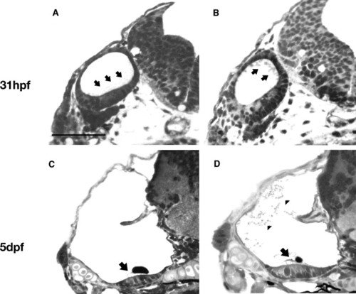 Histological sections of wildtype and cldnj embryos at 31 hpf and 5 dpf. Orientation is a cross-section of the head with the ectoderm to the left. The otic vesicle is the oval shape at 31 hpf (with the hindbrain to the right) and at 5 dpf it is the large cavity with part of the semicircular canal tissue visible as a projection into the cavity. (A) Histological cross-section through the zebrafish head of wildtype otic vesicle at 31 hpf. Black arrows indicate the ‘haze’ of otolith particles distributed along the ventral-lateral region of the vesicle. (B) cldnj mutant embryo. Otolith material appears as larger granules distributed throughout the vesicle (black arrows). (C) Wildtype ear at 5 dpf. Black arrow indicates the hair cell bundles attached to the fully formed otolith. (D) cldnj mutant ear at 5 dpf. Black arrow points to the normal appearing hair cell bundles attached to a reduced otolith. Arrowheads point to the unincorporated otolith particles still present in the endolymph. Scale bar=100 μm. |