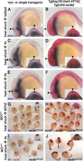 Six3 Misexpression Can Repress Diencephalic Nodal Activity If Induced by the Beginning of Somitogenesis Tg[hsp70l:Gal4-VP16]vu22;Tg[UAS-six3b]vu156 (B, D, and F) and single or nontransgenic siblings (A, C, and E), heat-shocked at tailbud (10 hpf) (A and B), 4s stage (C and D), or 6s stage (E and F). Arrowheads point at the left-sided dorsal diencephalic domain of Nodal activity represented by pitx2 expression. (G–J) Embryos from a cross between six3bvu87/+;Tg[hsp70l:Gal4-VP16]vu22 heterozygous and six3bvu87/+;Tg[UAS-six3b]vu156 heterozygous fish, which were injected with MOsix7 and heat-shocked at 80% epiboly (80%E) (G and H) or 4s stage (I and J). Insets are dorsoposterior view of the same embryo (A–F) or a representative embryo (G–I). L, left; R, right. Embryos are 22–24s stage. Genotypes in (G), (I), and (J) were inferred from clearly reduced eye size, demonstrating that embryos are six3b/six7 deficient. Because inducing six3b expression by heat shock at 80%E rescues the reduced eye size in six3b/six7-deficient embryos, embryos in (H) were PCR genotyped and the presence of all genotypes at expected ratios was confirmed.