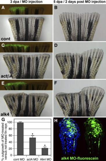 Morpholino-Mediated actA and alk4 Knockdowns Impair Fin Regeneration (A–F) Fins microinjected on one side with control (A and B), actA (C and D), and alk4 (E and F) fluorescein-tagged MOs and then electroporated. Bright-field and fluorescent images show fins at 3 dpa shortly after MO delivery to the regenerate (A, C, and E). Fluorescent MOs (green) are seen only in the injected half of the fin. The remaining noninjected half of the fin served an internal control for the growth rate. Corresponding images of the fins 2 days after MO delivery (5 dpa) are shown (B, D, and F). The control MO does not affect the size of the outgrowth relative to the noninjected side of the fin (B). The actβA and alk4 MOs impair the growth of the injected fin relative to the noninjected side, leading to the asymmetric shape of the regenerate (D and F). (G) Graph comparing the length of regenerates that regrew within 2 days after MO delivery in relation to the nontreated fin regenerate. It depicts the percent length of the outgrowth of the experimental side in relation to the control side (ten fins were analyzed, five of which were either ventrally or dorsally injected). Error bars represent the SEM. The asterisks denote the significant difference, p < 0.005. (H) Longitudinal section of the fin at 2 days after the alk4 fluorescent MOs delivery (5 dpa). Fluorescent (green) cells are identified in the epidermis and within the mesenchymal tissue distal to the amputation plane, indicating the efficiency of MO incorporation. DAPI in blue labels all nuclei.