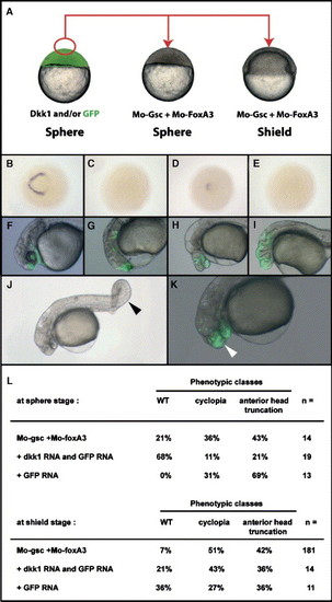 Rescue of headless phenotype by transplantation of Dkk1 expressing cells. (A) Scheme describing the experimental procedures. A group of cells from sphere stage embryos injected at the one cell stage with either dkk1 plus GFP RNA or GFP RNA alone was grafted at the animal pole of gsc/foxA3 knock-down embryos either at sphere or at shield stage. Host embryos were grown up to the 2–3 somite stage and were analyzed for the expression of emx1 or grown up to 24 hpf for morphological analyses. (B–E) emx1 expression in 2–3 somite stage embryos grafted with Dkk1/GFP expressing cells (B and D) or with GFP expressing cells (C and E). Grafts performed at sphere (B and C) or shield (D and E) stages. (F–K) Embryos grafted with Dkk1/GFP expressing cells (F, H, J, K) or with GFP expressing cells (G and I) at sphere (F, G) or shield (H, I, J, K) stages. Graft of cells expressing Dkk1 at shield stage is unable to rescue the headless phenotype (panel H and arrowhead in panel K) induced by gsc/foxA3 knock-down, whereas it results in a loss of ventral mesoderm (arrowhead in panel J) showing that Dkk1 secreted from grafted cells was able to efficiently inhibit wnt8a activity even at long distance. (L) Frequency of phenotypic classes obtained at 24 hpf after the abovementioned transplant experiments. (B–E) Dorsal views at the 2–3 somite stage, (F–K) lateral views at 24 hpf. |