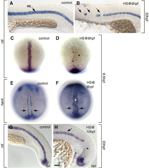 Notch signaling limits notochord and promotes hypochord development during gastrulation. (A, B, G, H) Side views, anterior to the left, at 20 hpf (22-somite stage) and (C, D) dorsal views, animal pole at top, at 9.5 hpf (YPC stage) showing ntl-expressing notochord cells. (A) Control embryo showing normal pattern of ntl-expressing notochord at the midline. (B) Expression of NICD at 6 hpf reduced trunk notochord (arrows). (C) Normal pattern of notochord precursors at 9.5 hpf. (D) The number of notochord precursors was reduced (asterisk) in embryos after induction of NICD at 6 hpf. (E, F) her4 expression in hypochord precursors at 9.5 hpf, dorsal view. (E) her4 was expressed in a row on both sides of the midline (arrows) in control embryos. (F) her4 was expressed throughout the midline (asterisk) after expression of NICD at 6 hpf. (G) Control embryo showing normal pattern of tail ntl expression in the notochord. (H) Expression of NICD at 10 hpf reduced tail notochord (asterisk), but trunk notochord appeared normal (arrow). Scale bar: 40 μm for panels A, B, G, H; 80 μm for panels E, F. |