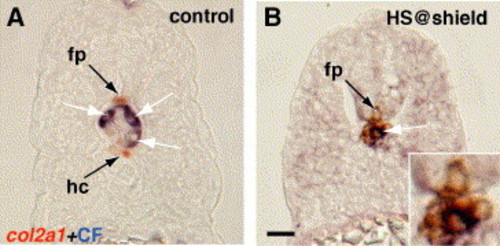 Notch signaling drives trunk axial mesoderm to a hypochord cell fate. (A, B) 24 hpf, transverse sections, showing col2a1 expression combined with staining to show photoactivated fluorescein signal. Three to five cells were labeled by photoactivation of caged fluorescein at the dorsal margin in control embryos and embryos expressing NICD beginning just before 6 hpf. (A) Labeled cells were found in the notochord (white arrow) and never in col2a1-expressing hypochord. (B) Cells derived from the notochord precursor domain expressed col2a1 following heat shock activation of Notch at 6 hpf. Inset shows enlarged view of midline region. Scale bar: 10 μm for panels A, B. |