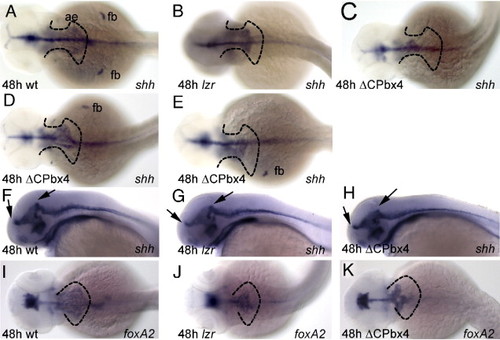 shh and foxa2 expression is disrupted in the anterior endoderm of pbx4- and meis-deficient embryos. (A) shh is expressed in the anterior endoderm (ae) and fin buds (fb) of 48 hpf wild type embryos. (B) lzr mutants (as identified by the absence of pectoral fin buds) exhibit reduced shh expression in the anterior endoderm. (C–E) shh expression is reduced in the anterior endoderm and fin buds of embryos injected with the dominant negative Meis construct (ΔCPbx4). Variations in the severity of the ΔCPbx4-mediated phenotype are likely due variable distribution of the injected mRNA, as routinely seen with this type of injections. (F–H) Prominent sites of neurectodermal shh expression (black arrows) are unaltered in lzr mutant and meis-deficient embryos. (I) foxa2 is expressed in the anterior endoderm of 48 hpf embryos. (J, K) Disruption of foxa2 expression in lzr mutant and meis-deficient embryos is similar to that seen for shh. Dashed black lines outline the normal expression domains of shh (A-E) and foxa2 (I-K) in the endoderm. Dorsal views in panels A-E, I-K; lateral views in panels F-H. Anterior is to the left in all panels.