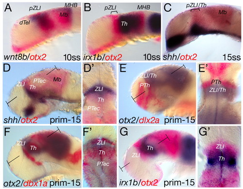 Mapping of otx2 expression relative to markers of the MDT. Whole-mount double in situ-hybridised wild-type embryos are mounted with anterior to the left and dorsal up. The markers and stages are indicated. (A) wnt8b marks the pZLI territory and shares the same anterior border as otx2 at ten somites (14 hpf). (B) At the same stage, otx2 is expressed in the territory from the pZLI to the midbrain, whereas irx1b and otx2 are co-expressed in the presumptive thalamic area and anterior midbrain. (C,D) At 15 somites (16.5 hpf), shha expression is induced within the otx2-positive domain (C) and its anterior border coincides with the anterior expression border of otx2 at prim-15 (30 hpf; D). (D') A cross-section shows that the otx2 expression domain marks the ZLI and the thalamus whereas the ZLI is only shha positive. In the pretectum, otx2 is weakly expressed. (E,E') dlx2a marks the territory of the prethalamus and is anteriorly adjacent to the otx2 expression domain (E); the cross-section reveals the abutting expression domains (E'). (F,F') Similarly to the shha expression domain, the expression domain of dbx1a overlaps with that of otx2 at the anterior ZLI domain and at the thalamus. (G,G') At 30 hours, the expression domain of irx1b persists in the thalamus, whereas the ZLI domain is only otx2 positive. T-shaped brackets mark the plane of the section in the following picture. dTel, dorsal telencephalon; Mb, midbrain; MHB, midbrain-hindbrain boundary; prim-15, primordium stage 15; PTec, pretectum; PTh, prethalamus; pZLI, presumptive zona limitans intrathalamica; ss, somite stage; Th, thalamus; ZLI, zona limitans intrathalamica.