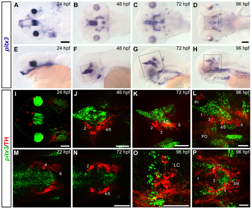 pitx3 and TH are not co-expressed in any CA group. (A-H) Whole mount in situ hybridization showing pitx3 expression pattern at 24 hpf (A, E), 48 hpf (B, F), 72 hpf (C, G) and 96 hpf (D, H). Dorsal (A-D) and lateral (E-H) views of the head are represented, anterior is to the left. (I-P) Confocal z-projections of whole mount FISH to pitx3 (green) and anti-TH immunohistochemistry (red) representing the spatial relationship between pitx3-expressing and THir cells. (I) Dorsal overview of the head at 24 hpf (35 μm projection). (J) Single plane confocal image of a 48 hpf embryo, the approximate diencephalic area framed in F is shown. (K) Lateral view (38 μm projection) of a 72 hpf embryo (area framed in G). (L) Lateral view (50 μm projection) of a 96 hpf embryo (frame in H). (M, N) Two different dorsal planes of the same confocal stack (M dorsal to N) showing the diencephalic area of a 72 hpf embryo: pitx3 expression is mainly detectable in medial and dorsal position with respect to the THir neurons of the posterior tuberculum, and no co-localization can be detected with any DA group. (O) Dorsal view (15 μm projection) of the locus coeruleus at 96 hpf. (P) Dorsal view (9 μm projection) of the DA groups in the diencephalon at 96 hpf (approximate area framed in D is shown). I, M, N, O, P dorsal views; J, K, L, lateral views; anterior is to the left. Scale bars in A for A-C, E-G and in D for D, H: 100 μm. Scale bars in I-P: 50 μm.