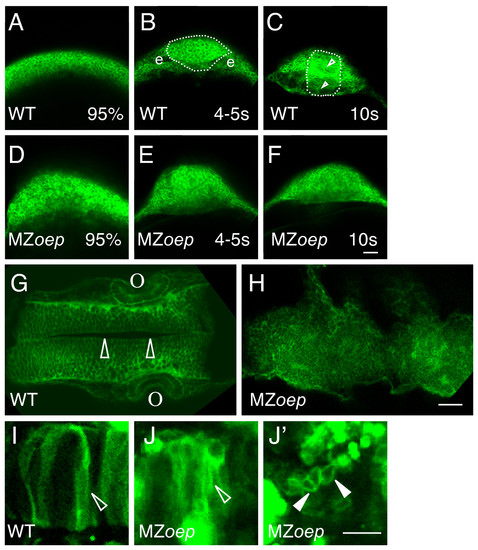 The ordered structure of the neural tube is disrupted in MZoep embryos. (A-H) Embryos were injected at the one cell stage with mGFP mRNA and imaged (A-F) live at 95% epiboly (95%), the 4–5 somite stage (4–5 s), the 10 somite stage (10 s), or (G, H) fixed at ~24 hpf. (A-F) Cross sections through the anterior developing neural plate, with presumptive eyes (e) indicated in panel B, the outer boundary of the neural tube indicated by a dotted line in panels B and C, and the midline indicated by the open arrowheads in C. (G, H) Horizontal sections through the midbrain and hindbrain of ~24 hpf embryos, with the midline of the brain (open arrowheads) and the otic vesicles (o) indicated in panel G. (I-J′) Embryos were injected at the one cell stage with DNA encoding mGFP, raised to ~24 hpf, and imaged live in high magnification horizontal sections. Open arrowheads indicate elongated cells and the closed arrowheads indicate round cells. All images are confocal optical sections. Scale bars: 40 μm (A-H), 80 μm (I-J′). |