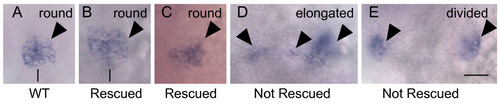 Injection of n-cad mRNA into MZoep embryos. Embryos were injected at the one cell stage with n-cad mRNA, raised to approximately 24 hpf, and fixed and processed for whole mount in situ hybridization with a probe for otx5. (A) WT and (B, C) some N-cad overexpressing MZoep embryos have a round shaped pineal morphology indicative of a closed pineal organ. (D, E) Other N-cad overexpressing MZoep fish have an elongated or divided pineal organ, demonstrating that their NTD has not been corrected. All images are dorsal views with anterior to the top. The background in Panel C has a pink cast because the embryo was too fragile to remove from the yolk. The midline of the brain is apparent in panels A and B, and is indicated by a black line. Scale bar: 40 μm (A-E).