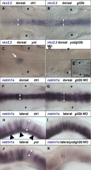 Gli2b and r4. nkx2.2 expression in the hindbrain in 30 hpf, dorsal view. (A) control, (B) Gli2b morphant. nkx2.2 expression domain was slightly expanded in Gli2b morphant (two-headed arrow). (C) yot-/- mutant. (D) yot-/-/Gli2b morphant without nkx2.2 expression in the hindbrain (black arrow). This phenotype is similar to that in smu-/- (E). (F) Dorsal and (H) lateral view of netrin1a expression in the hindbrain of 30 hpf controls and Gli2b morphants (G, I). In Gli2b morphants netrin1a expression in the ventral hindbrain domain was up-regulated and expanded laterally. (J) In yot-/-, netrin1a expression was affected ventrally, but unaffected dorsally. After injection of Gli2b MO into yot-/- only a trace of expression was detected in the r4 (black arrow, F). Black arrowhead in panel H—floor plate expression domain; white bullet line in panels H and J defines D-V extent of expression domain. Abbreviations: e, ear. |
