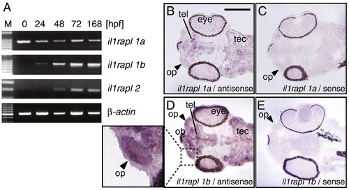 Expression of zebrafish il1rapl genes. (A) Expression of zebrafish il1rapl1a, il1rapl1b and il1rapl2 mRNA in the 0 hpf, 24 hpf, 48 hpf and 72 hpf zebrafish embryos and 168 hpf larva estimated by RT-PCR. The sizes of il1rapl1a, il1rapl1b and il1rapl2 fragments were 825 bp, 828 bp and 211 bp, respectively. β-actin fragment of 490 bp served as a positive control. (B, C) Sections of 60 hpf embryos stained by in situ hybidization with DIG-labeled antisense (B) and sense (C) probes of the zebrafish il1rapl1a mRNA. (D, E) Sections of 60 hpf embryos stained by in situ hybidization with DIG-labeled antisense (D) and sense (E) probes of the zebrafish il1rapl1b mRNA. The dashed region in (D) including the olfactory placode is magnified on the left. eye, eye; ob, olfactory bulb; op, olfactory placode; tec, tectum; tel, telencephalon. Arrowheads point olfactory placodes. Scale bar, 100 μm. |