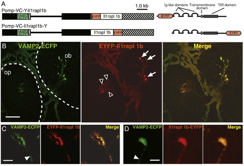 Localization of zebrafish Il1rapl1b tagged with EYFP in developing zebrafish olfactory sensory neurons. (A) Omp promoter-driven expression vectors for EYFP-Il1rapl1b fusion protein and VAMP2-ECFP (Pomp-VC-Y-Il1rapl1b, top) and for Il1rapl1b-EYFP-fusion protein and VAMP2-ECFP (Pomp-VC-Il1rapl1b-Y, bottom) in olfactory sensory neurons. Black boxes, the omp promoter; crosshatched boxes, the 3′ downstream sequence of the omp gene; hatched boxes, SV40 polyadenylation signal sequence; lines, pBluescript II SK+. Schematized structures of EYFP-tagged Il1rapl1b proteins are on the right. (B) Representative VAMP2-ECFP signals (left, green) and EYFP-Il1rapl1b signals (middle, red) in olfactory sensory neurons of Pomp-VC-Y-Il1rapl1b-injected embryos at 60 hpf. These signals are merged on the right. op, olfactory placode; ob, olfactory bulb. Arrows and arrowheads point cell bodies and axon terminals, respectively. Bar = 20 μm. (C, D) Representative VAMP2-ECFP signals (left, green) and EYFP-fusion protein signals (middle, red) in the axon terminal of olfactory sensory neuron of Pomp-VC-Y-Il1rapl1b (C)-or Pomp-VC-Il1rapl1b-Y (D)-injected embryos at 60 hpf. These signals are merged on the right. Arrowheads point axonal shafts. Bar = 5 μm. |