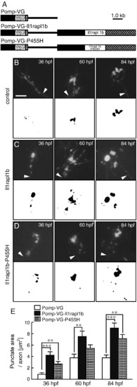 Effect of IL1RAPL 1B and IL1RAPL 1B-P455H expression on the VAMP2-EGFP punctum formation in axon terminals of olfactory sensory neurons. (A) Omp promoter-driven expression vectors for VAMP2-EGFP (Pomp-VG, top), for IL1RAPL 1B and VAMP2-EGFP (Pomp-VG-Il1rapl1b, middle) and for IL1RAPL 1B-P455H and VAMP2-EGFP (Pomp-VG-P455H, bottom) in olfactory sensory neurons. Black boxes, the omp promoter; crosshatched boxes, the 3′ downstream sequence of the omp gene; hatched boxes, SV40 polyadenylation signal sequence; lines, pBluescript II SK+. (B-D) Representative VAMP2-EGFP signals in olfactory neuron axon terminals in Pomp-VG (B)-, Pomp-VG-Il1rapl1b (C)-or Pomp-VG-P455H (D)-injected embryos at 36 hpf (left), 60 hpf (middle) and 84 hpf (right) are shown in the upper panels. The threshold images of VAMP2-EGFP signals are on the bottom. Arrowheads point axonal shafts. Bar = 5 μm. (E) The area of VAMP2-EGFP puncta in axon terminals of olfactory sensory neurons in Pomp-VG (open bars)-, Pomp-VG-Il1rapl1b (filled bars)-and Pomp-VG-P455H (stippled bars)-injected embryos at 36 hpf, 60 hpf and 84 hpf. Pomp-VG, n = 33, 41 and 40 for 25, 29 and 27 embryos at 36 hpf, 60 hpf and 84 hpf, respectively; Pomp-VG-Il1rapl1b, n = 41, 39 and 49 for 25, 27 and 26 embryos at 36 hpf, 60 hpf and 84 hpf, respectively; Pomp-VG-P455H, n = 41, 43 and 44 for 26, 27 and 27 embryos at 36 hpf, 60 hpf and 84 hpf, respectively. Two-way ANOVA, expression vector effect, F = 27.9, p < 0.001. All values represent mean ± SEM. ** and ***, p < 0.01 and< 0.001, respectively. |
