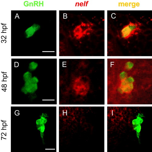 GnRH3-producing neurons transiently express nelf mRNA. A-H: Staining of Tg(gnrh3:EGFP) embryos with fluorescent enhanced green fluorescent protein (EGFP) antibody (A,D,G) and nelf riboprobe (B,E,H). A single optical slice of confocal micrograph (1.8 μm). Dorsal view, anterior to the top. C,F: The analysis reveals colocalization in the olfactory epithelium at 32 hours postfertilization (hpf; C) and in the terminal nerve at 48 hpf (F). At 72 hpf, GnRH3 neurons no longer express nelf (I). Scale bar = 10 μM. |