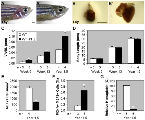 Phenylhydrazine hydrochloride treatment of wild-type zebrafish recapitulates the cardiac remodeling process of tr265/tr265. (A–A′) PHZ treatment results in anemia in zebrafish, as evidenced by (A′) the paleness in the gill region, compared to (A) the control; bar = 1 mm. (B–B′) (B′) Anemia-induced cardiomegaly seen after three weeks of treatment versus (B) the control; bar = 1 mm. (C) Ventricle area to body length index of week-6, week-13, and year-1.5 control and PHZ-treated fish. (D) Body length (in mm) of the control vs. PHZ-treated fish. (E) MEF2+ cell density (cells/mm2) of year-1.5 control and treated fish. (F) Percent of proliferating MEF2+ cells in year-1.5 control and treated fish. (G) Percent relative hemoglobin concentration in the year-1.5 control and treated fish. (C–G) mean±SEM; * = P<0.05; n = number of fish examined. |