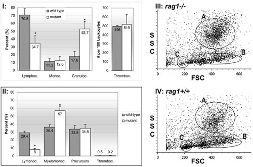 Mutant and wild-type zebrafish leukocyte differentials and flow cytometry scatter plots. I and II represent differential counts on peripheral blood smears and kidney hematopoietic tissue smears, respectively. Asterisks indicate significant difference between wild-type and mutant blood cells within the specific population. Average percentage ± standard deviation from 10 replicates is shown (p ≤ 0.05). III and IV show graphs of flow cytometric results on cells from mutant and wild-type kidney tissues, respectively. Graphs represent pooled data from 4 runs on 4 separate mutant and wild-type fish. Forward scatter (FSC) and side scatter (SSC) analyses of whole kidney cell suspension differentiates three distinct cell populations: A-macrophage/monocytes and granulocytes, B-hematopoietic precursor cells and C-lymphocytes and lymphocyte-like cells. Note the reduction in gate C, characteristic of lymphocytes and lymphocyte-like cells, in mutant kidney cell suspensions.