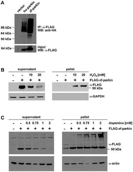 Zebrafish parkin promotes auto-/transubiquitylation and is prone to misfolding in the presence of high level oxidative stress. (A) Zebrafish parkin shows auto-/transubiquitylation activity. HEK293T cells were co-transfected with HA-ubiquitin and either FLAG-tagged human parkin (hu-parkin) or FLAG-tagged zebrafish parkin (zf-parkin). The cells were treated with the proteasomal inhibitor MG-132 overnight. At 24 h after transfection, cells were harvested, lysed under denaturing conditions, and cleared by centrifugation. The supernatants were subjected to an immunoprecipitation (IP) using anti-FLAG agarose beads. The immunoprecipitates were resolved by SDS-PAGE and immunoblotted with an anti-HA mAB (WB). Aliquots of the supernatants were removed before immunoprecipitation and were immunoblotted with anti-FLAG mAB (input, lower panel). (B) SH-SY5Y cells were transiently transfected with FLAG-tagged zebrafish parkin (FLAG-zf-parkin) and exposed to oxidative stress (10 and 20 mM H2O2, 30 min). The cells were then lysed in detergent buffer (0.1% Triton X-100 in PBS), and fractionated into detergent-soluble (supernatant) and -insoluble (pellet) fractions by centrifugation. Parkin present in the supernatant and pellet fraction was analyzed by Western blotting using an anti-FLAG monoclonal antibody. GAPDH (only present in the soluble fraction) was used as a loading control. (C) SH-SY5Y cells were transiently transfected with FLAG-tagged zebrafish parkin (FLAG-zf-parkin) and exposed to dopamine stress (0.5, 0.75, 1 and 2 mM, 5 h). The cells were then lysed in detergent buffer (0.1% Triton X-100 in PBS), and detergent-soluble and -insoluble fractions were analyzed as described in (B). Actin was used as a loading control. |