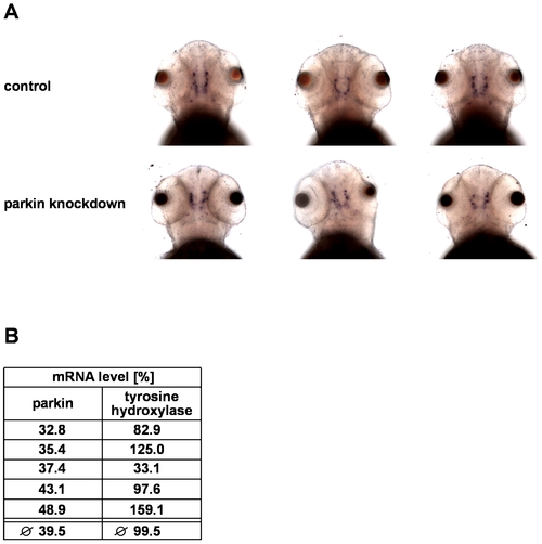 Parkin deficiency has no effect on tyrosine hydroxylase levels in zebrafish. (A) In situ hybridization using an antisense RNA probe for tyrosine hydroxylase (TH) as a marker for dopaminergic neurons. Staining of parkin knockdown and control-injected zebrafish larvae shows large interindividual variations in both the control and parkin knockdown group. Dorsal views of three-day-old larvae. (B) There is no correlation between the efficiency of parkin knockdown and TH mRNA levels. TH mRNA levels were quantified in parkin-knockdown zebrafish using semi-quantitative real-time PCR. The amount of zebrafish TH-specific mRNA was normalized to β-actin in parkin GT-grip-injected zebrafish larvae compared to control-injected embryos at day 3 after injection.The graph shows the results of 5 independent experiments. In each experiment 10–15 zebrafish larvae per group were analyzed. |