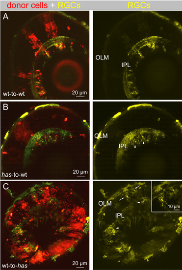 Dendritic misprojections of ectopically located retinal ganglion cells in the has mutant is non-cell autonomous. In each chimera, donor cells were labeled by a lineage tracer (red), fluororuby. Donor cells were always taken from the isl2b:MGFP line (yellow), either in a wild-type (wt) or has background, to better visualize dendrites. (A) Wild-type donor cells transplanted to a wild-type host. RGC dendritic arbors were oriented toward the OLM and stratified within an IPL. (B) has donor cells transplanted to a wild-type host. All has RGCs were located in the GCL (arrowheads). C. Wild-type donor cells transplanted to a has host. Most RGCs were located in the GCL (arrowheads), but a few cells were located ectopically (arrows). Inset shows higher magnification of the misplaced RGCs indicated by the arrows. |