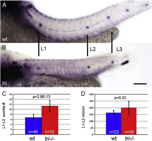 Proneuromast deposition is not triggered by traversing somite boundaries. (A,B) eya1 in situ hybridization labels deposited proneuromasts. (A) A wt embryo with a typical distribution of proneuromasts. (B) A tri homozygous mutant displays similarly spaced proneuromasts, even though somites are narrower. (C) Quantification of somites between the first two proneuromasts in wt and tri mutants. Mutant primordia cross significantly more somite boundaries between proneuromast depositions in tri mutants. (D) The actual distance between these proneuromasts in wt and tri mutants is not significantly different. Scale bar equals 50 μm. Error bars represent standard deviation from the mean. |