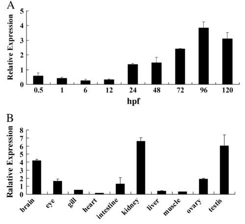 Transcriptional analysis of rrm2b gene in developing embryos and adult tissues of zebrafish. Total RNAs were isolated from embryos and indicated tissues and real-time PCR was then performed. Values are normalized to 18s RNA level and vertical bars represent the mean ± SD (n = 3). (A) Transcriptional expression of rrm2b during embryogenesis. Total RNA was isolated from 30 to 50 embryos at indicated stages. Developing stages are shown as hours post-fertilization (hpf). (B) Expression of rrm2b in adult tissues. Total RNA was isolated from brain, eye, gill, heart, intestine, kidney, liver, muscle, ovary and testis of two adult zebrafish. |