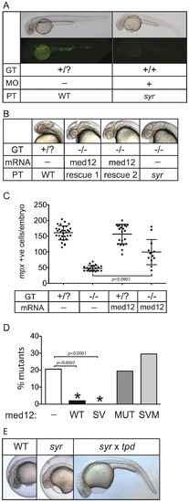 Genetic validation of V1046D mutant Med12 underpinning syr phenotype. (A) Phenocopy of syr by injection of Med12 morpholino; phenotype (PT), genotype (GT) and morpholino (MO) injection are indicated. The upper panel are bright field photos and the lower panels show WT and syr on a Tg(mpx:EGFP) background for enumeration of mpx expressing cells. (B) Rescue of syr neural phenotype with wild-type Med12; phenotype (PT), genotype (GT) and mRNA injected. (C) Rescue of myeloid defect in syr by overexpression of wild-type Med12 mRNA; genotype (GT) and mRNA injected are indicated. (D) Rescue of syr with wild-type (WT) Med12 and Med12 containing the two sequence variations, N1763S and a 12 bp deletion but not the V1046D mutation (SV). Rescue does not occur with injection of V1046D Med12 (MUT) or Med12 containing the two sequence variations in addition to the V1046D mutation (SVM). (E) Non-complementation of syr with trapped (tpd). Rescued mutants were PCR genotype confirmed. |