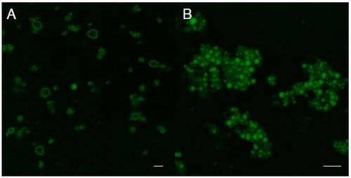 Fluorescent liposomes are formed following addition of BODIPY-FL analogs to sonicated egg yolk. A. BODIPY-FL C16 partitions preferentially into liposomal membranes making liposomes appear as fluorescent rings when viewed using confocal microscopy. B. BODIPY-FL C5 partitions into the liposomal core, making liposomes appear as fluorescent circles. BODIPY-FL C12, C2, and the BODIPY alone also partition into the aqueous core of liposomes (data not shown). Scale bars are 5 μm. |