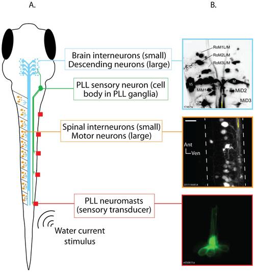 The posterior lateral line (PLL) sensorimotor pathway in zebrafish larvae. A. Schematic representation of a 6 day old zebrafish larva (dorsal view) showing, in different colors, all of the neuron types included in the model pathway, and the effective stimulus for hair cell activation (water current). Neuron types are labeled to the right of the schematic. B. Photomicrographs showing individually identifiable neurons within the PLL sensorimotor pathway. Top: Descending neurons in the hindbrain of a 6 day old zebrafish larva after injection labeling with a fluorescent tracer. The Mauthner neurons (M), Mauthner segmental homologs (Mid2, MiD3), and other identifiable descending neurons can be seen. The image is a maximum projection of 22 optical sections taken at 3 µm intervals through the dorsal-ventral axis of the hindbrain. Anterior is up and the yellow line shows the approximate midline. Middle: Spinal neurons imaged in a 7 day old larva prepared as described for A. The image is a maximum projection of 10 optical sections taken at 2 µm intervals through the rostral spinal cord at approximately the level of the 8th myotome. The dashed white lines trace the spinal cord′s boundaries, and the yellow arrow is drawn along the bundle of descending axons running down the ventral spinal cord. Bottom: A PLL neuromast. This neuromast was imaged in a single optical section in a 6 day old Brn3c:eGFP transgenic larva, in which all lateral line neuromasts express GFP. Individual hairs (cilia) can be seen extending toward the top of the image. Sensory neurons (not shown) contact the hair cell bodies, which can be seen at the bottom of the image. Scale bars = 20 μm. |