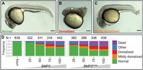 Overexpression activity differs between BMP3 variants. Overexpression utilized human BMP3 constructs, since the mature peptides of human and dog/wolf BMP3 are identical. (A–C) Whole mount embryos at embryonic stage 24 hpf, anterior to the left. Phenotypes are representative of (A) normal, (B) dorsalized, (C) mildly dorsalized classes following injection of human BMP3 mRNA into one-cell staged zebrafish embryos. (D) Stacked bar graph summarizing phenotypes observed following wt BMP3 or BMP3F452L mRNA injection. The dysmorphic phenotypes classified as “other” included combinations of mild dorsalization, tail curving, occlusion of the yolk extension, and invariably, hypoplasia or necrosis of head structures. Doses listed are in picograms (pg) of mRNA (x-axis). The frequencies of phenotypes are indicated by the y-axis. Each dose was repeated five or more times. The number of embryos injected is listed above each dose. Injection of BMP3F452L more potently dorsalizes embryos compared to wt BMP3 (student′s t-test P<0.05 for 25–75 pg doses, <0.01 for 100 pg dose). |