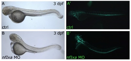 Vessel formation is comparable in control and nfixa-MO fliI-GFP-trangenic injected embryos. (A-B′) Visible (A,B) and fluorescent images (A′,B′) of GFP-vessels visualized in control (A,A′) and nfixa-MO (B,B′) injected embryos at 3 dpf. |