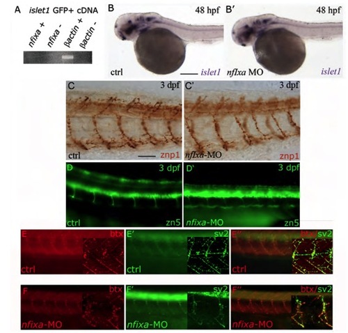 Nfixa loss of function does not influence motoneurons development (A) RT-PCR performed on cDNA of motoneurons sorted from islet1 GFP transgenic embryos at 48 hpf. nfixa is not expressed in this cell population. (B,B′) islet1 expression pattern in nfixa-MO embryos at 48 hpf does not present differences in comparison with control embryos, suggesting that motoneurons are correctly formed. (C-D′) Axonal projections of primary (C,C′) and secondary motoneurons (D,D′) visualized by znp1 and zn-5 antibodies, respectively, are correctly formed in nfixa-MO-injected embryos. (E-F′′) Synapses were labeled with bungarotoxin (BTX red, postsynaptic AChRs) and SV2 (green, presynaptic vesicles) antibodies. The co-localization of both signals in control (E′′) and nfixa-MO injected (F′) embryos showed functional neuromuscular synapses. Main panels are images taken on a fluorescence microscope; insets show single-plane confocal images/projections from a confocal z-stack.
