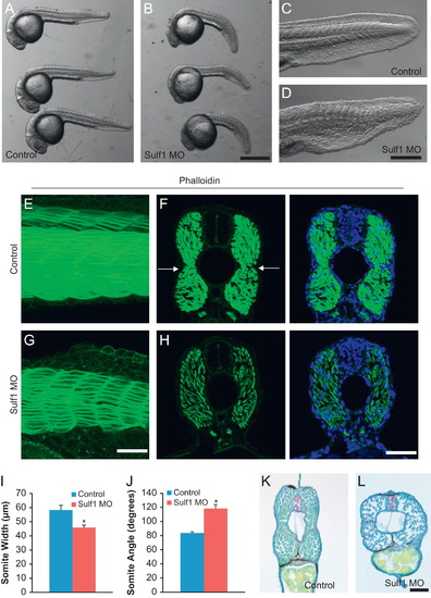 Knockdown of sulf1 leads to somite defects including loss of the horizontal myoseptum. (A) Whole mount view of three fish injected with control morpholino and fixed at 24 hpf, showing normal tail development. (B) Whole mount view of three fish injected with 0.25 pmol sulf1 MO, showing curvature and widening of the tail. (C) Higher magnification view of a control fish at 24 hpf, showing normal chevron-shaped somites. (D) Higher magnification view of a sulf1 morphant fish showing more closely spaced, obtusely angled somites. (E) Lateral view of whole-mount of 48 hpf control zebrafish labeled with 488-conjugated phalloidin. Again normal chevron-shaped somites can be seen. (F) Cross-section of control zebrafish labeled with 488-conjugated phalloidin with arrows marking the distinct horizontal myoseptum that runs along the midline of the fish, counterstained with DAPI. (G) Lateral view of whole-mount of 48 hpf sulf1 morphant zebrafish labeled with 488-conjugated phalloidin, taken at the same exposure and settings as (E). Labeled muscle fibers are much less dense than in controls, and the somites appear rounded, more obtusely angled, and closer together. (H) Cross-section of sulf1 morphant fish at 48 hpf, showing the sparser muscle fibers and the absence of a morphological horizontal myoseptum. (I and J) Quantification of somite width (I) and angle (J) between control and sulf1 morphant fish. Quantification was done on the two somites closest to the proctodeum (approximately somite 15). sulf1 morphants had significantly narrower somites that had a significantly more obtuse angle than control fish (p<0.001 for both, T-test). (K and L) Vibratome cross-section of control (K) or sulf1 morphant (L) zebrafish at 48 hpf stained with hemotoxylin and eosin showing the decreased density of muscle fibers and loss of the horizontal myoseptum in sulf1 morphants. Scale bars: A, B: 500 μm; C, D: 250 μm; E, G: 50 μm; F, H: 50 μm; K, L: 50 μm. |