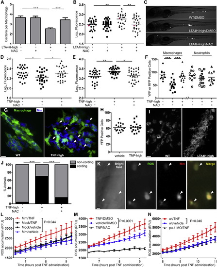 TNF-Mediated ROS Production Kills Both Mycobacteria and Infected Macrophages (A) Mean (±SEM) number of bacteria per infected macrophage in WT and LTA4H-high larvae in presence or absence of 40 μM NAC. ***p < 0.001 (one way ANOVA with Tukey’s posttest). (B) Bacterial burden (FPC) in WT and LTA4H-high siblings in presence or absence of 40 μM NAC. **p < 0.01 (one-way ANOVA with Tukey’s posttest). Representative of two independent experiments. (C) Representative fluorescence microscopy images of individual fish in (B) represented by red dots. (D) FPC of 1 dpi larvae injected with TNF or vehicle in the presence or absence of 40 μM NAC. p < 0.05 (one-way ANOVA with Tukey’s posttest). Representative of two independent experiments. (E) FPC 3 dpi of the same fish in (D). *p < 0.05; ***p < 0.01 (one-way ANOVA with Tukey’s posttest). Representative of two independent experiments. (F) Number of yellow fluorescent macrophages or red fluorescent neutrophils in 2 dpi fish one day after injection with TNF or vehicle in presence or absence of 40 μM NAC. ***p < 0.001 (one-way ANOVA with Tukey’s posttest). (G) Confocal microscopy of granulomas in 3 dpi Tg(mpeg1:YFP) larvae injected with TNF or vehicle. White arrowheads show extracellular bacteria. Scale bar, 10 μm. (H) Number of yellow fluorescent macrophages in Tg(mpeg1:YFP) uninfected fish 1 day postinjection with TNF or vehicle. Difference not significant by Student’s t test. Representative of two independent experiments. (I) Representative fluorescence microscopy images of 4 dpi WT and LTA4H-high larva. Scale bar, 10 μm. (J) Percentage of animals in (D) and (E) with cording 4 dpi. ***p < 0.001 (Fisher’s exact test). (K) Representative fluorescence microscopy images of 1 dpi LTA4H-high larvae 6 hr after incubation with CM-H2DCFDA. Arrowheads point to infected macrophages. Scale bar, 10 μm. (L) Quantification of ROS production as relative fluorescence units (RFU) (±SEM) in WT siblings infected with Mm or mock-infected (see Experimental Procedures) at the indicated time points after injection of TNF or vehicle. (two-way ANOVA). Representative of two independent experiments. (M) Quantification of ROS production as RFU (±SEM) in WT infected siblings at the indicated time points after injection of TNF or vehicle in presence or absence of 40 μM NAC. (two-way ANOVA). (N) Quantification of ROS production as RFU (±SEM) in infected WT or PU.1 morphant siblings at the indicated time points after injection of TNF or vehicle. (two-way ANOVA). (Also see Figures S1, S2, and S3). |