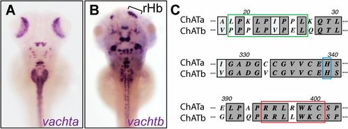 Duplicated zebrafish ChATb. Distribution of vachta (A) and vachtb (B) transcripts in 5-dpf larvae with asymmetrical habenular expression indicated. rHb, right habenula indicated by bracket. (C) Alignment of ChATa and ChATb sequences at the acyltransferase site (green), conserved histidine domain (blue), and putative enzyme catalytical domain (red). |
