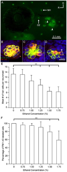 Ethanol but not methanol treatment affects the number of functional sensory hair cells in the lateral line. Brn3c-GFP transgenic zebrafish embryos were raised in embryo medium supplemented with varying concentrations of ethanol. Prior to fixation, the larvae were stained with FM 1-43FX (red) to determine if hair cell mechanotransduction channels were functional. (A) Lateral view of a Brn3c-GFP zebrafish. Clusters of bright green GFP-labeled hair cells are found in neuromasts along the head and body of the animal. The O2 and Mi1 neuromasts are highlighted along with inner ear organs (small arrows). Higher magnification of hair cells of the O2 neuromast taken from z-stacks show that (B) hair cells in untreated controls and (C) 1% ethanol-treated animals had no observable morphological differences though there were fewer hair cells in the 1% ethanol-treated animals. Almost all of the GFP-labeled hair cells were co-stained with FM 1-43FX. (D) Fewer sensory hair cells were observed in neuromasts of animals treated with 1.5% ethanol. There were also fewer double-labeled cells (arrowhead) and more single labeled cells (asterisk). (E) Stereocilia bundles were counted to determine the number of hair cells present in the O2 neuromast. Control numbers were similar to those reported in other studies [23], [31]. Significantly fewer hair cells (**p<0.01) were counted in ethanol-treated larvae at concentrations greater than 1% per volume when compared to controls. No differences in the number of hair cells were observed in larvae treated with 1.5% methanol. (F) The percentage of GFP-labeled cells that were also co-stained for FM 1-43 decreased as the concentration of ethanol increased but not in methanol-treated larvae. There was a significant decrease (**p<0.01) in the number of double-labeled hair cells at the two highest concentrations of ethanol tested. Results are the mean values ± SD. n = 8-21 per condition. |