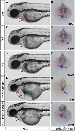 Treatment with LiCl partly rescues cardiac defects caused by overexpression of miR-19b. Representative images of cardiac morphology (A, C, E, G and I) and cmlc2 in situ hybridization (B, D, F, H and J) are shown in 48 hpf zebrafish embryos. Mir-19b mimic-injected embryos displayed severe pericardial edema (G) and looping defects (H), which were rescued by treatment with 0.15 μm LiCl immediately after miR-19b injection (I and J). In contrast, cardiac morphology and looping were normal in WT (A and B), NC-injected (C and D) and 0.15 μm LiCl-treated embryos (E and F). Red arrow: ventricle; blue arrow: atrium; yellow arrow: pericardial edema.  |